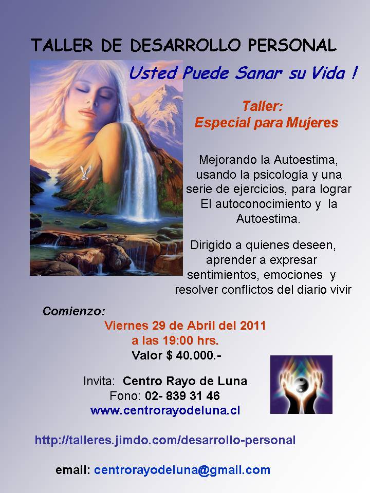 Desarrollo del Taller: (ver detalle en Temario) Conocimiento Profundo de sí mismo Contacto con uno mismo Cuidado y atención a uno mismo Contacto con el otro Contacto con el niño interior Integración y cierre. Dirigido a: Mujeres interesadas en el conocimiento de si mismas. Aprender a expresar sus pensamientos y sentimientos, emociones y a resolver conflictos (personles, familiares, sociales, laborales) del diario vivir.